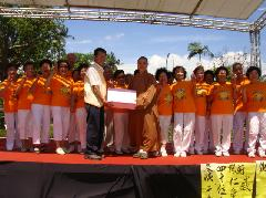 交流會會長簡永成感謝「千歲樂團」帶來數曲的活力勁舞,讓今天的活動洋溢著歡喜,並致贈精美餐盒給長輩們享用;主任覺方法師也回贈仁愛之家刊物。
